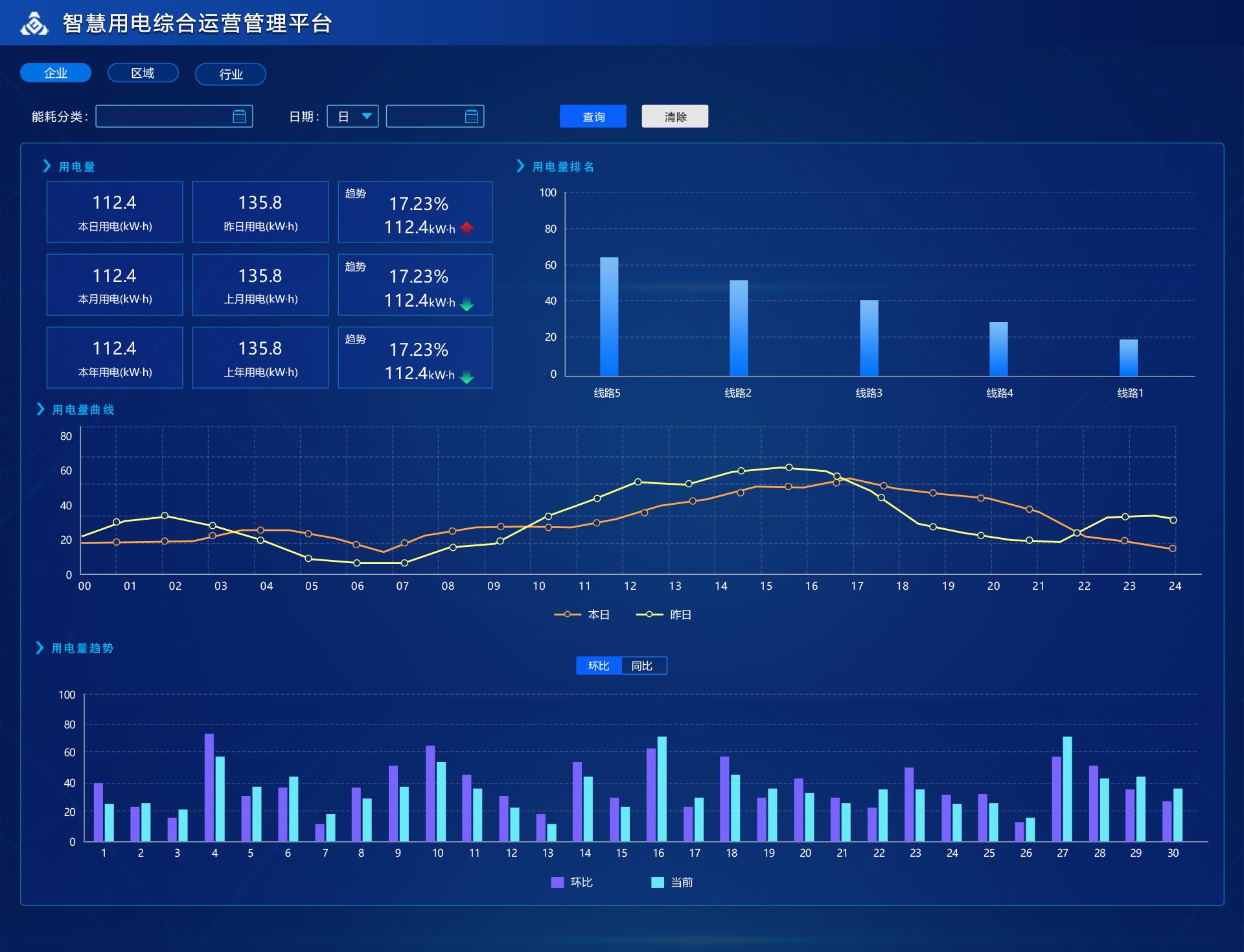 對管轄區域內用電情況進行概括,一圖展示報警信息、電量統計、設備狀態、線路數據、檢修工單,管理人員概況,平臺界面條理清晰,布局合理。