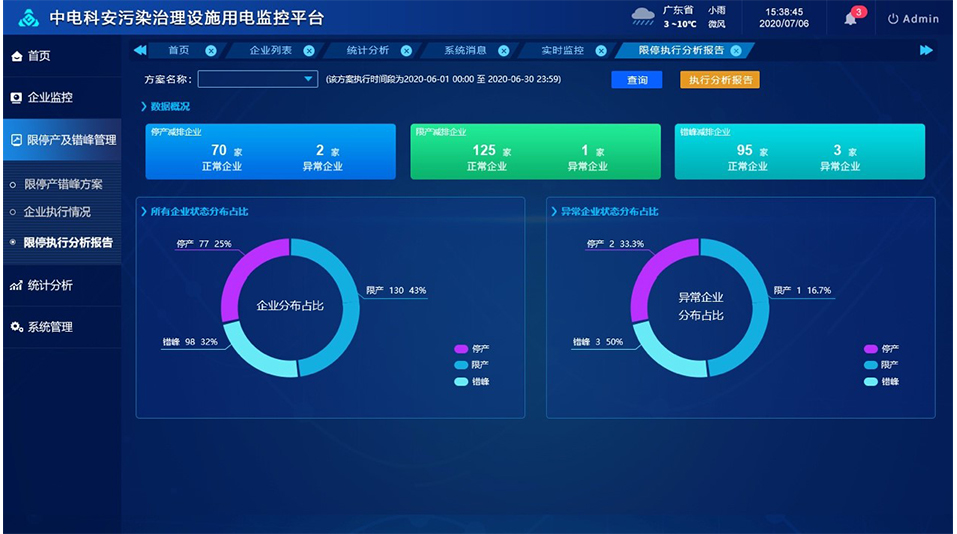 顯示限停產錯峰方案的執(zhí)行分析報告、企業(yè)狀態(tài)數量統(tǒng)計及分布占比。