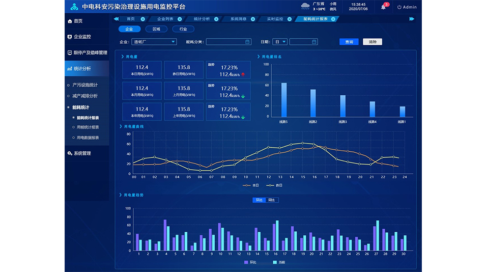 按企業(yè)、區(qū)域、行業(yè)三個維度統(tǒng)計在查詢時間內的用電能耗相關數據。
