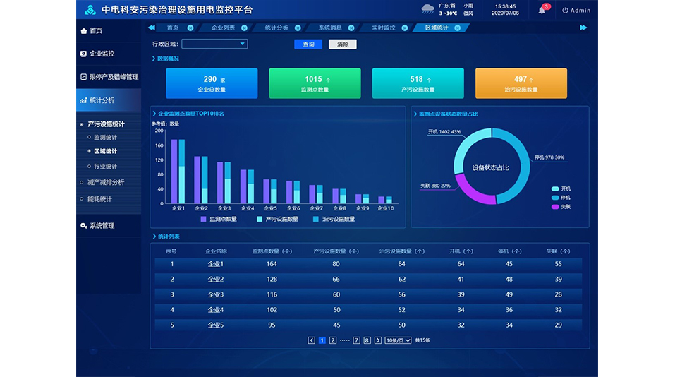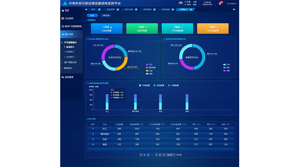 從行業(yè)或區(qū)域維度統(tǒng)計企業(yè)數量、企業(yè)監(jiān)測點數量及狀態(tài)。